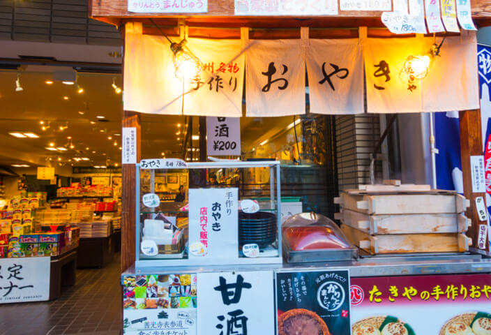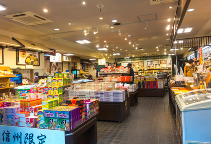 当店オリジナル商品の人気のきなこ餅や八味唐辛子 信州限定商品から小布施の栗菓子、信州あんず、産地直送野沢菜漬けなどの食品から、仏具やお線香、民芸品まで幅広く北信濃の名産、みやげ品を豊富に取り揃えおります。 又、店舗前では一年を通して季節の野菜を使った出来立ての手作りおやきを販売しております。